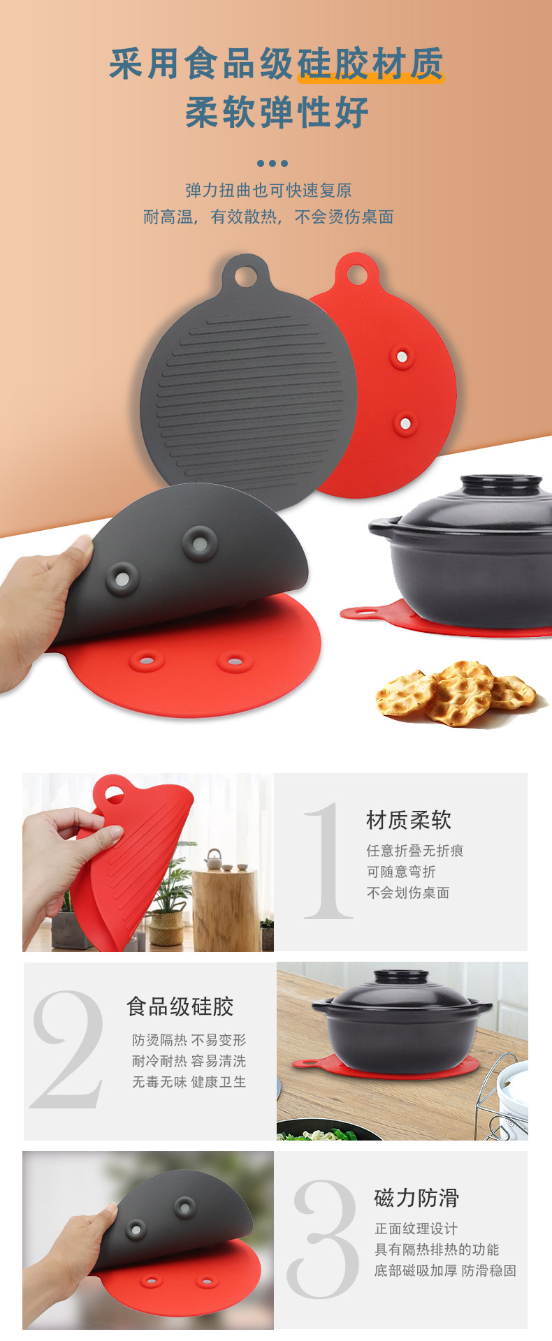 【簡介】圓形磁鐵硅膠隔熱餐墊 防燙墊 廚房防水防滑鍋墊 硅膠餐墊