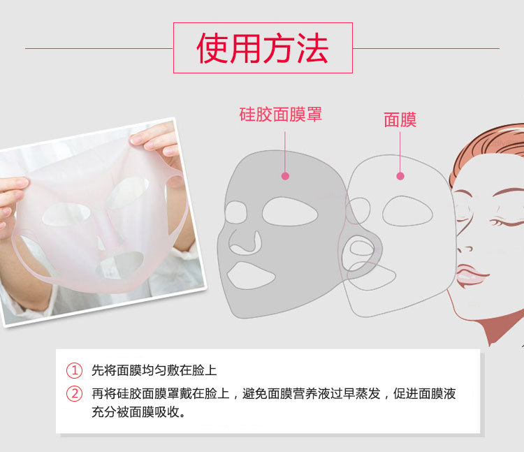 先敷上面膜,再將硅膠面膜罩罩在面膜上,等待15~20分鐘之后取下,可以使面膜精華液更充分吸收。
