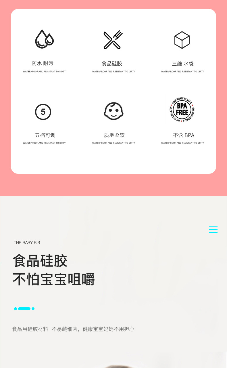 嬰幼兒唾液分泌一直以來(lái)每個(gè)家庭中都沒(méi)有得到很好的解決方法,嬰兒從出生知道一歲多這個(gè)時(shí)間段里面張嘴口腔動(dòng)作屬于萌芽期,所以流口水也不是它們的錯(cuò),吃飯灑漏更不是他們的錯(cuò),所以寶媽們洗衣服也是沒(méi)理由的,而目前只能選擇以預(yù)防為主,而硅膠圍嘴兜目前是主要的嬰幼兒防護(hù)用具,所以看準(zhǔn)這幾個(gè)因素選對(duì)圍兜可輕松很多。