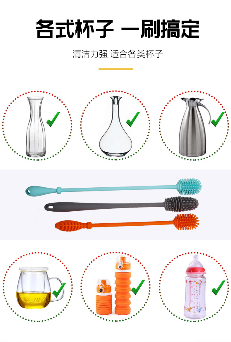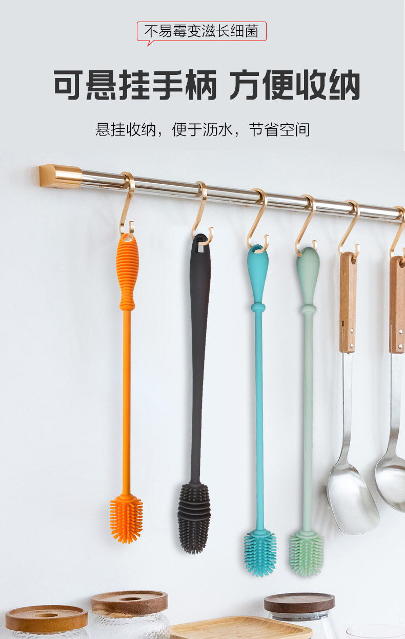 給心愛的杯子配一個硅膠刷,可以360度清潔水杯內壁,刷頭采用食品級硅膠,不含BPA,無異味,相比海綿瓶刷不容易變形,不容易殘留水分滋生細菌。適合各類杯子的清潔??铺├鳛橐患夜枘z制品OEM廠家,有能力也有條件定制可彎頭的硅膠刷,人性化的設計,易懸掛便利瀝水,節(jié)約空間。
