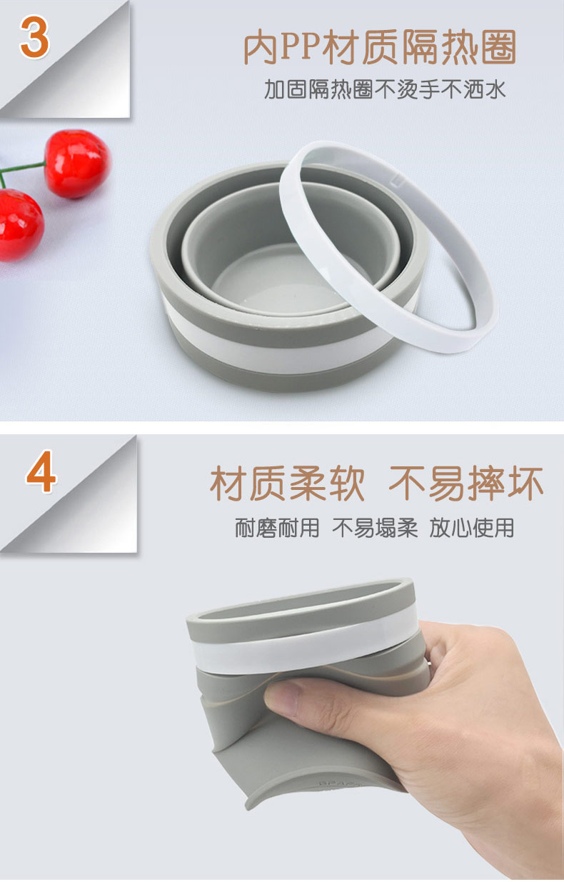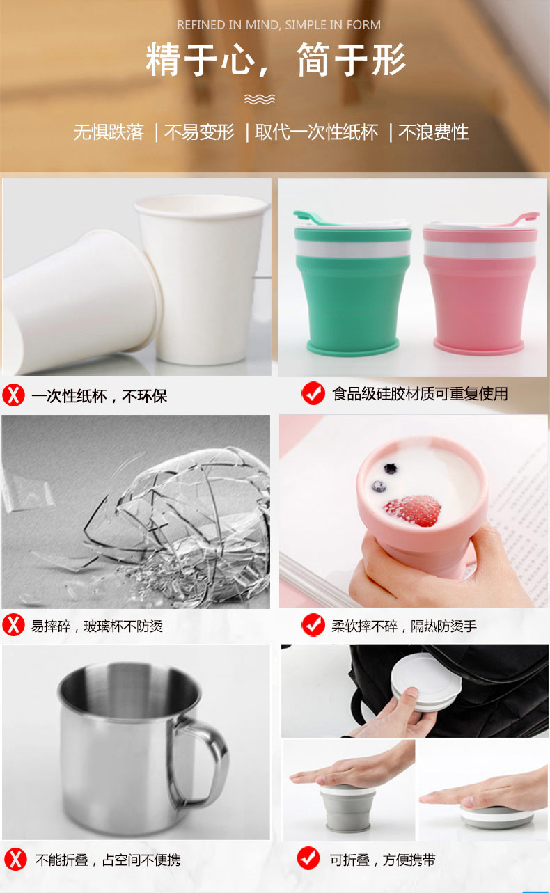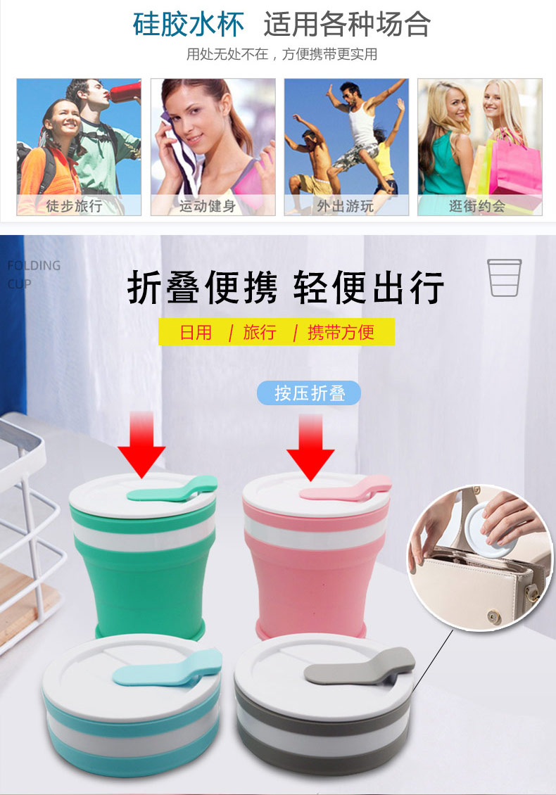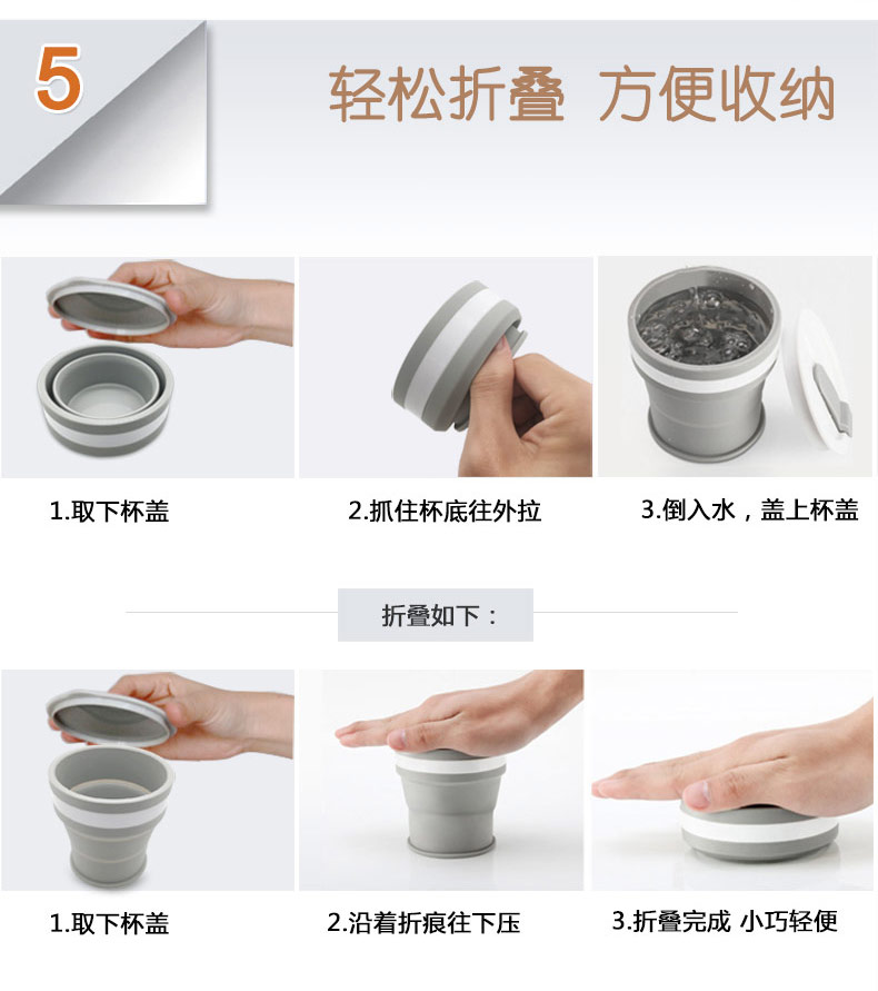 折疊式硅膠水杯成為運動以及郊游的便攜物品之一,水喝完后直接折疊放入口袋減小儲物空間替代了對水壺和瓶裝礦泉水的不足, 完全顛覆了消費者對硅膠折疊水杯的看法,硅膠折疊杯是一種攜帶方便、使用衛(wèi)生、具有雙層杯壁的折疊杯。外壁的兩個相鄰段通過螺紋連接,內(nèi)壁的兩個相鄰段為錐形配合,可上下移動。通過外壁螺紋旋轉驅動內(nèi)壁上下展開,實現(xiàn)杯形折疊和拉伸動能。